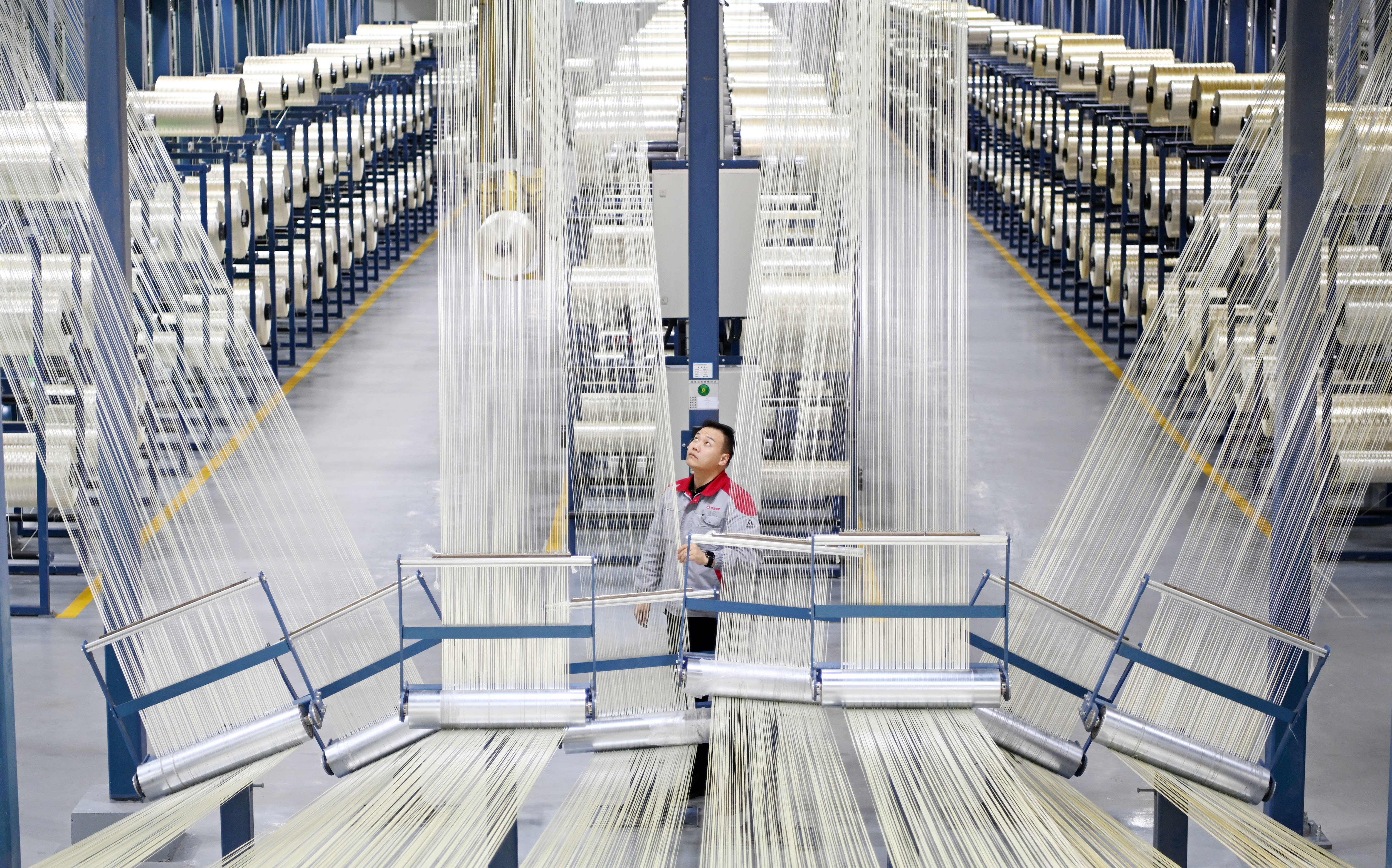 (工作人员在中国建材集团西宁万吨碳纤维生产基地整理碳纤维原丝。资料图片 新华社发)